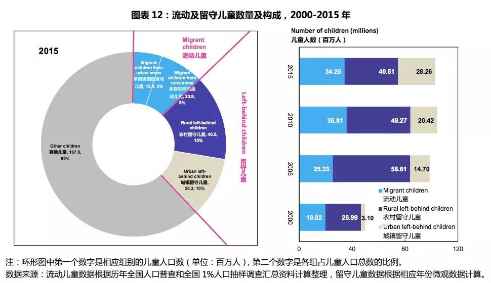 笼统的说,中国有1亿名儿童受人口流动的影响。这个数据来自联合国儿童基金会发布的报告《2015年中国儿童人口状况——事实与数据》。但是这个数据是根据2015年全国1%人口抽样调查数据和2010年全国人口普查数据推算出来的。