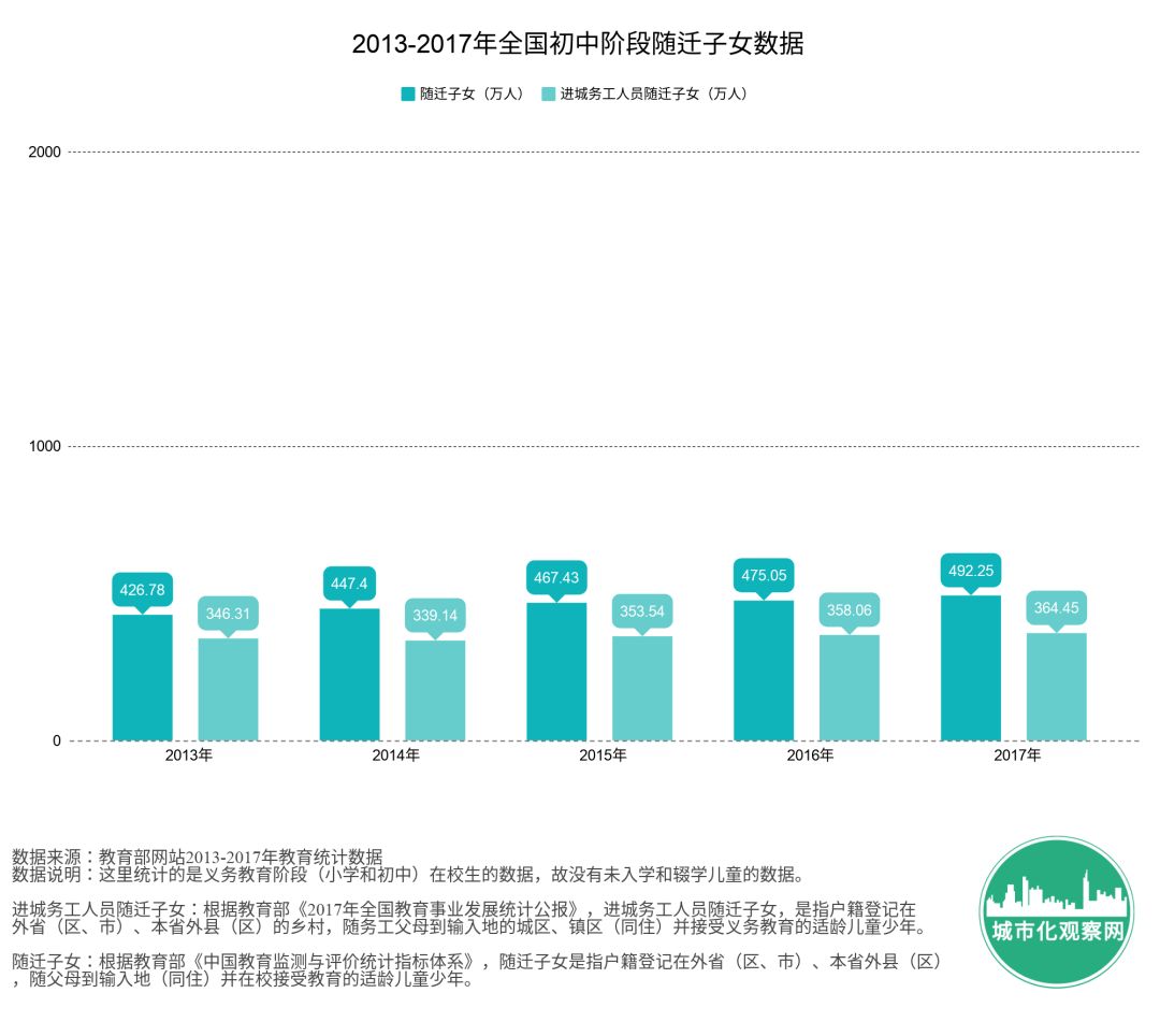 2017年初中阶段随迁子女数量为492.25万人,近5年增加了65.47万人;2017年初中阶段进城务工人随迁子女数量为364.45万人,近5年增加了18.14万人。