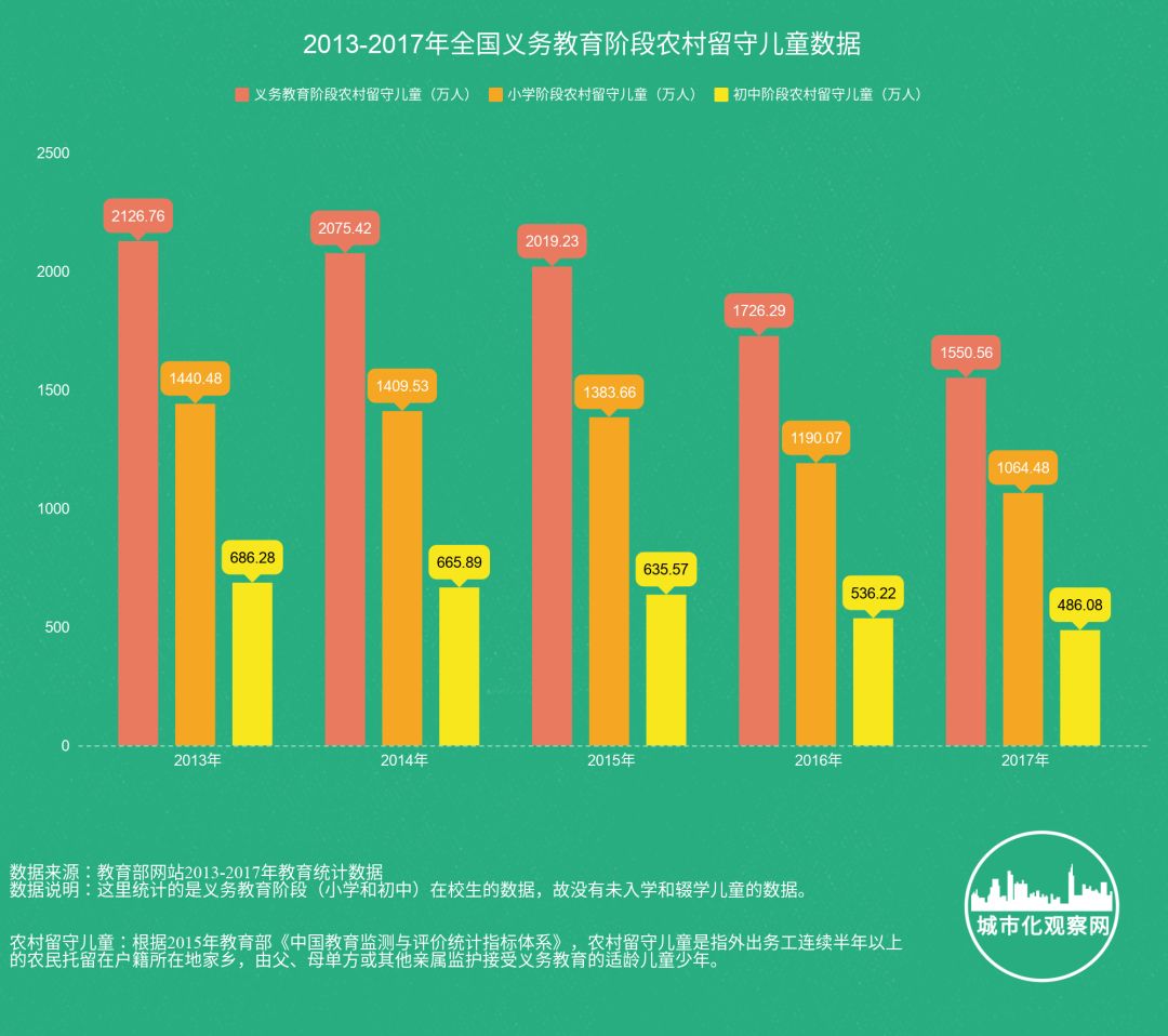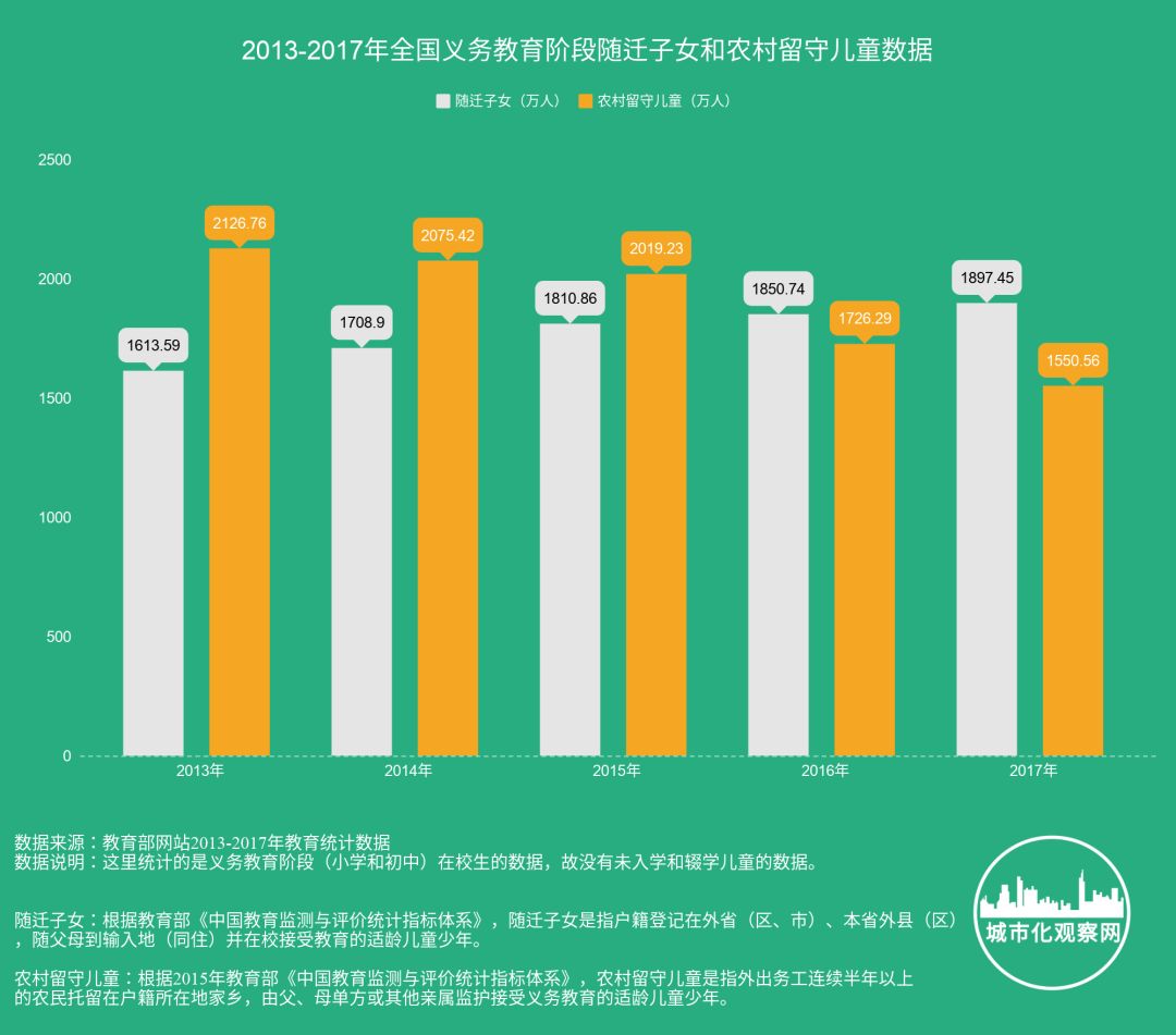 城市化观察网(ID:cityobserve)根据教育部于2018年8月发布的2017年教育统计数据进行计算发现,2017年义务教育阶段随迁子女和农村留守儿童数量分别为1897.45万人和1550.56万人,合计3448万人;近5年义务教育阶段随迁子女增加了283.86万人,农村留守儿童减少了576.2万人。