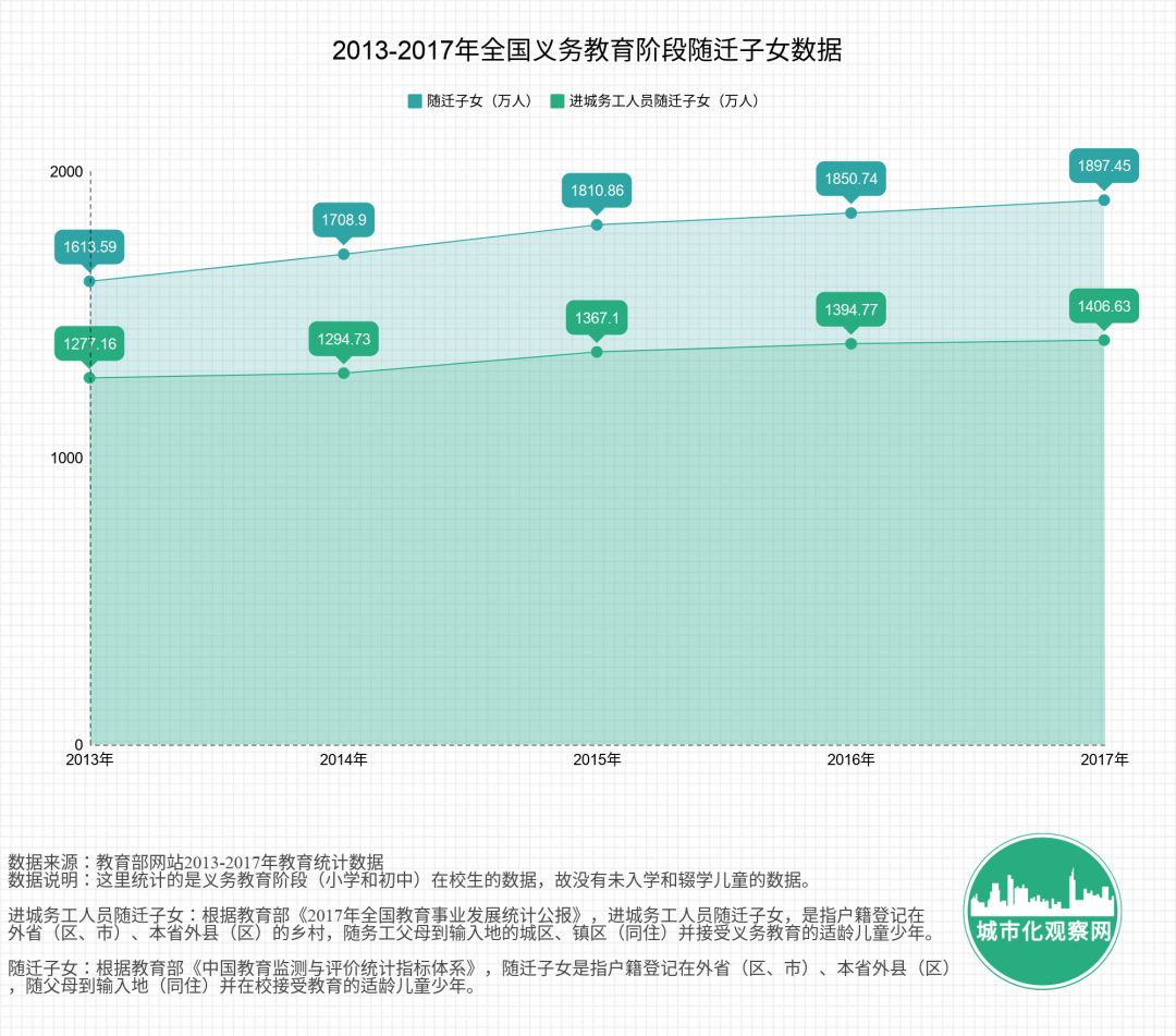 2017年义务教育阶段随迁子女数量为1897.45万人,近5年增加了283.86万人,增幅为17.6% ;其中进城务工人员随迁子女数量为1406.63万人,近5年增加了129.47万人,增幅为10.14%。